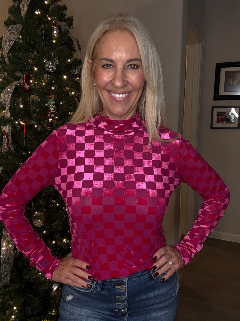 Enhance your wardrobe with the Times Square Velvet Mesh Top in Pink Checkered. Featuring delicate lettuce-edge hems, a stylish mock neck, glitter accents, a blend of sheer mesh and velvet checkered fabric, this versatile top is perfect for layering or wearing alone. Elevate your seasonal outfits and shine with effortless glamour in this essential piece!