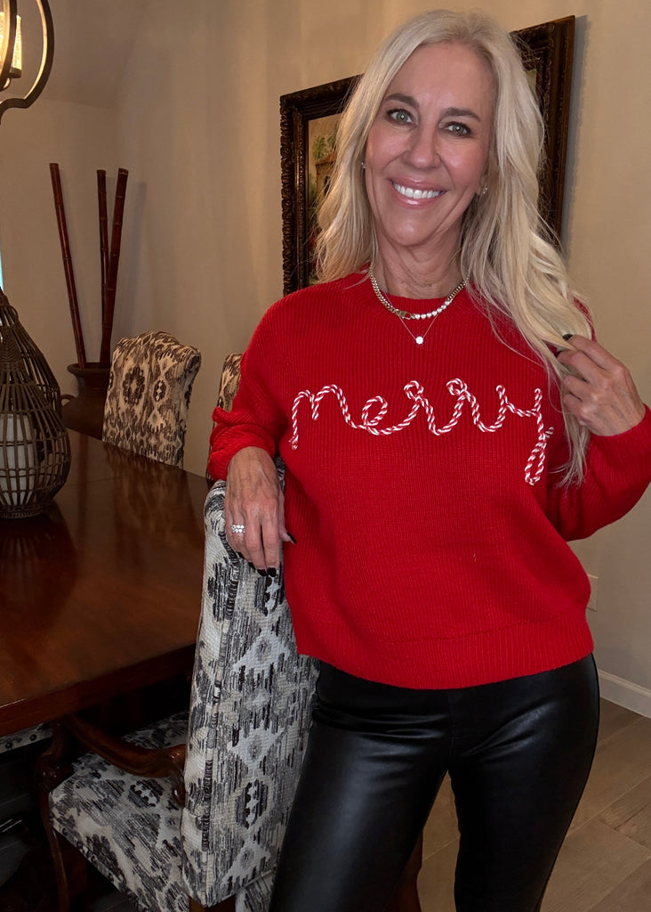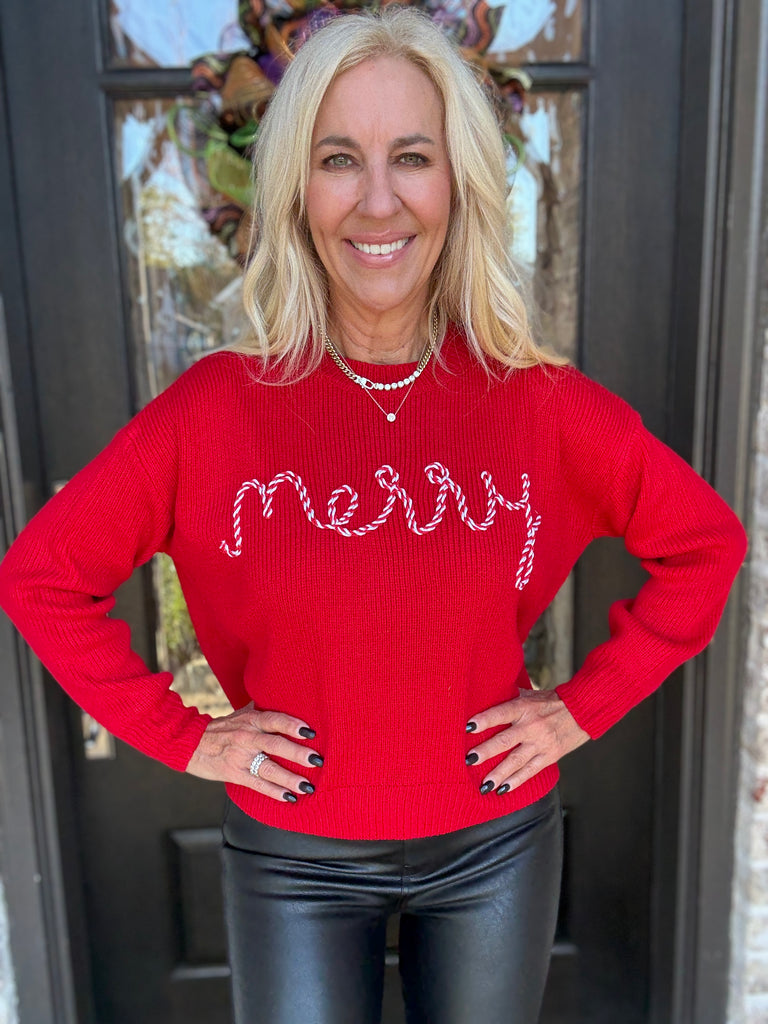 Stay cozy and festive with the Candy Cane Crush sweater, featuring a cheerful candy cane "Merry" design on the front. This soft red sweater adds a touch of holiday spirit to your wardrobe while keeping you warm and comfortable. Perfect for spreading joy during the season or giving as a thoughtful gift.