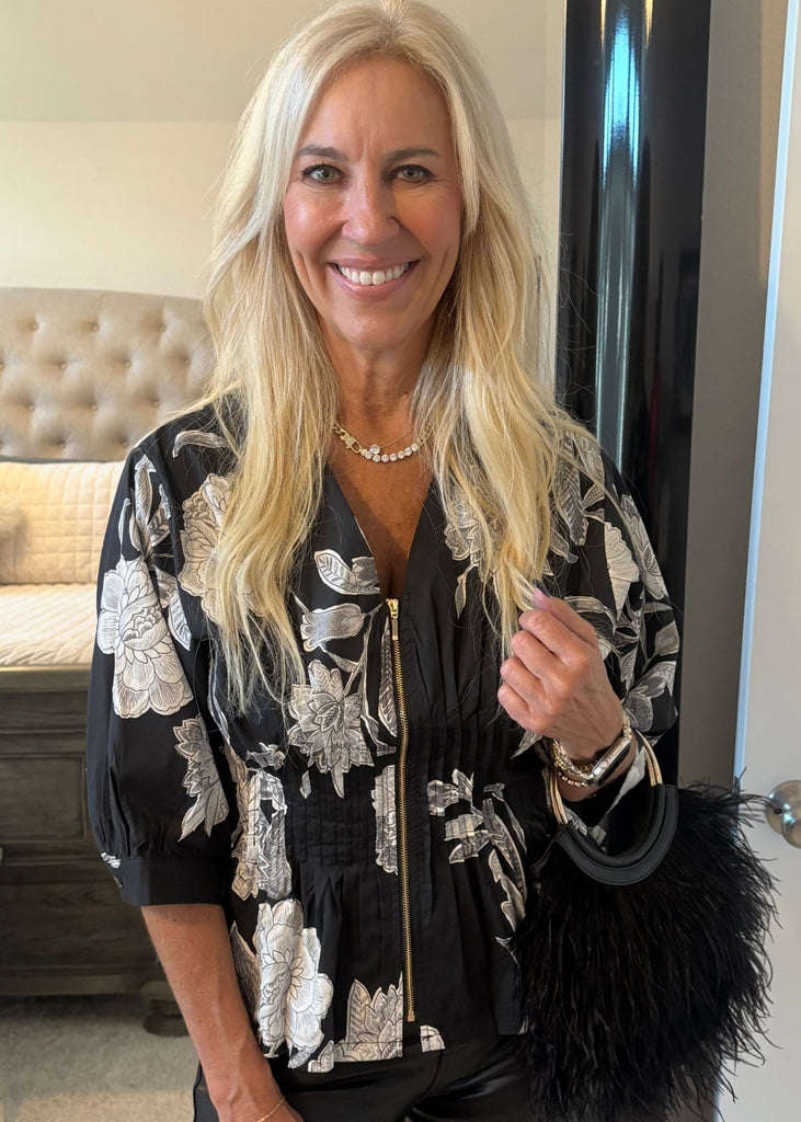 This black and white floral top features a convenient front zipper for easy wear, complemented by elegant pleat details around the waist that enhance your natural shape. Its timeless color combination and thoughtful design offer both style and comfort, making it a versatile addition to your wardrobe for any occasion.