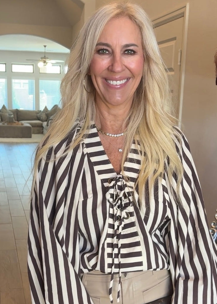 Elevate your look with this brown and ivory striped dolman sleeve top, designed to combine comfort and style effortlessly. The lace-up front adds a unique, eye-catching detail that sets you apart from the crowd. Its relaxed fit ensures all-day ease while keeping you chic—make this versatile piece a must-have in your wardrobe today.