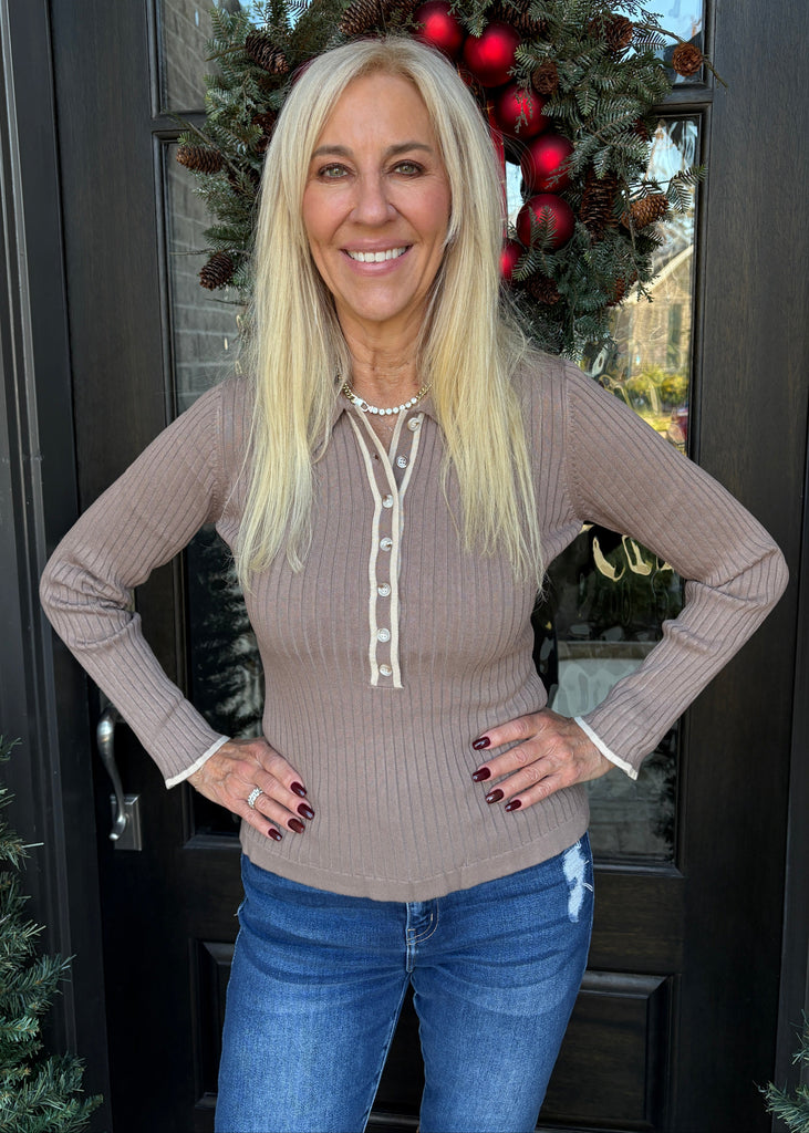 Elevate your everyday wardrobe with this mocha fitted sweater, designed to flatter your silhouette with its tailored cut. The classic button-front closure adds versatility and ease, while delicate ivory trim details frame the neckline and wrists for a polished, sophisticated touch. Perfect for layering or wearing solo, this piece transitions seamlessly from office to weekend. The rich mocha tone pairs effortlessly with neutrals and bold colors alike, making it an essential staple that works harder in your closet.