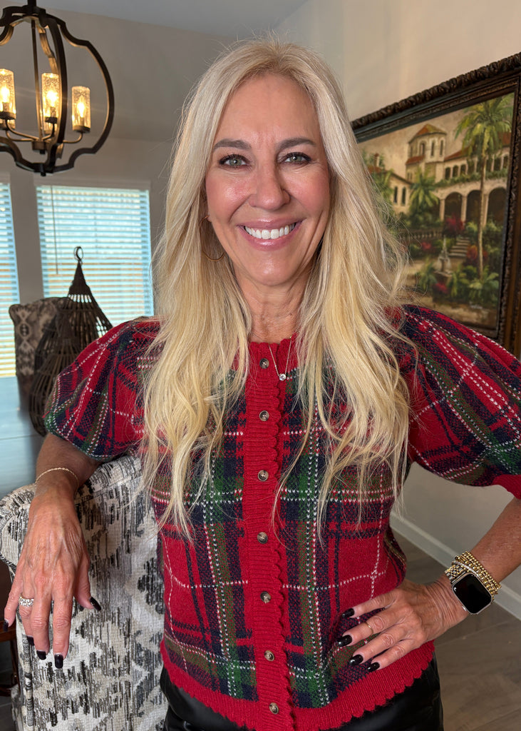 This red plaid button-front sweater combines classic patterning with charming scallop trim for a cozy yet stylish look. The button closure allows easy layering, while the scalloped edges add a delicate touch that elevates your everyday outfit. Perfect for cooler days, it offers warmth without sacrificing feminine detail.