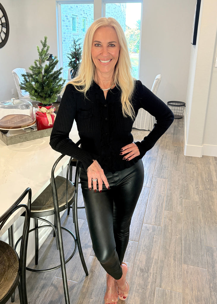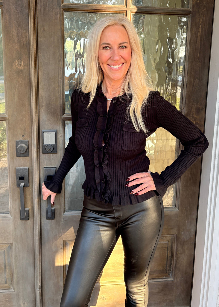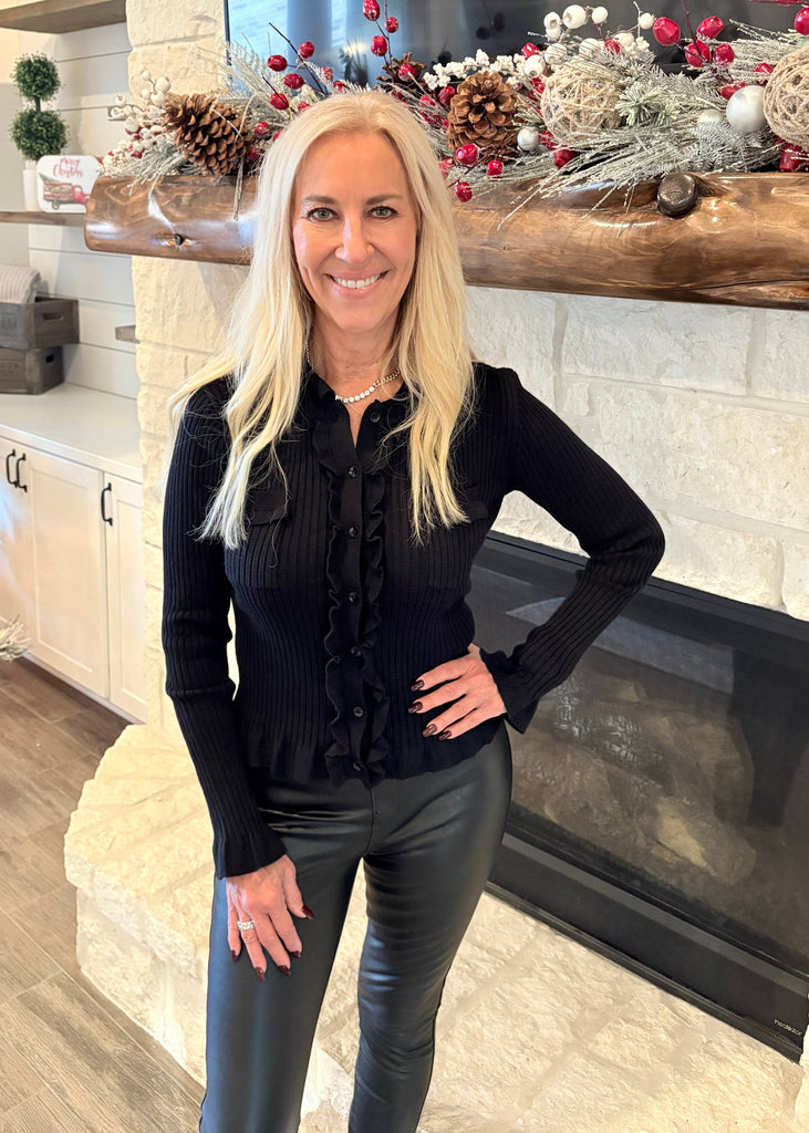 Elevate your everyday style with this stunning black cardigan featuring delicate scallop trim and charming ruffles along the button front, collar, and hem. Crafted from ribbed, ultra-stretchy fabric, it moves with you for all-day comfort while maintaining its polished shape. The true-to-size fit ensures a flattering silhouette that works beautifully layered over dresses, tees, or worn solo. A versatile wardrobe essential that transitions seamlessly from office to weekend.